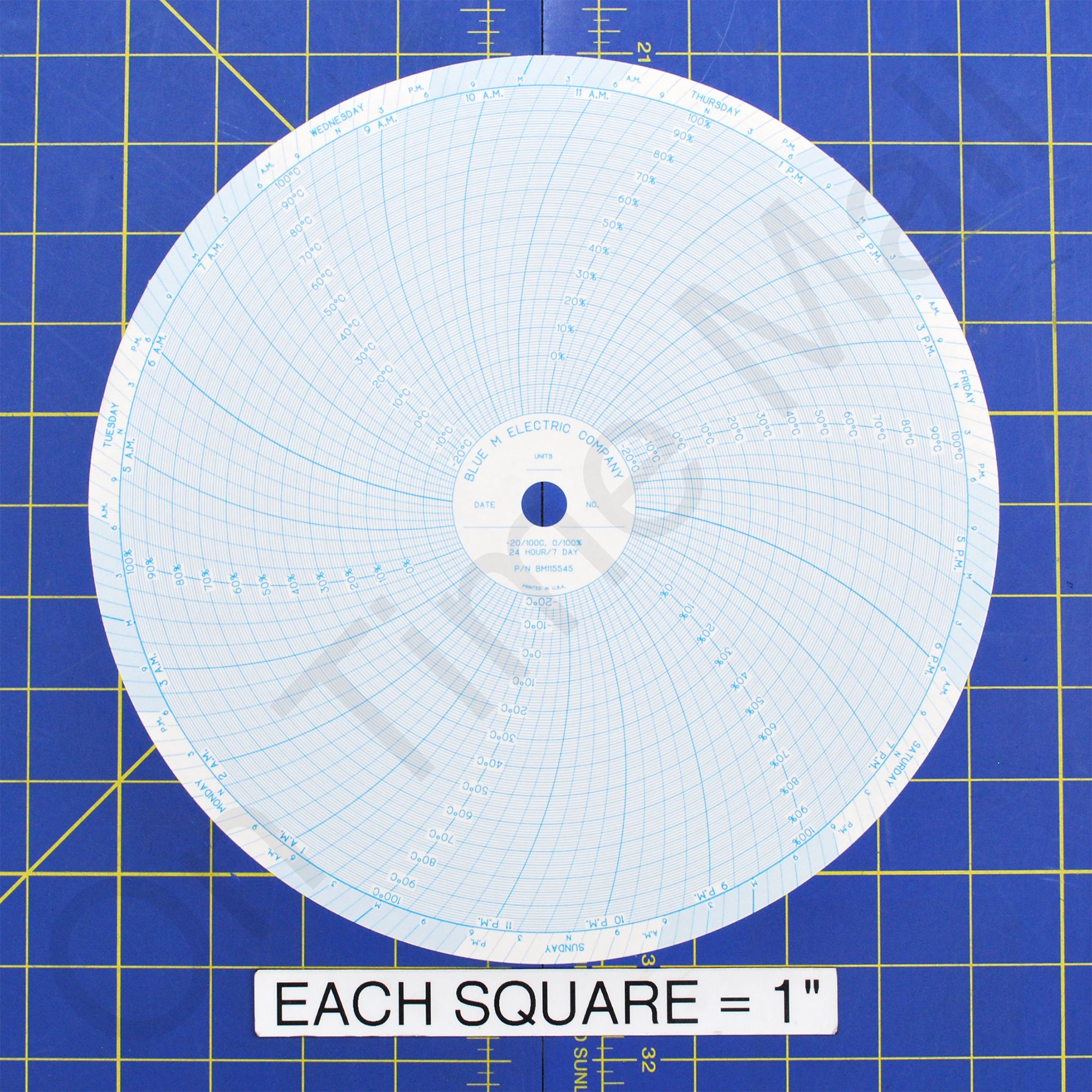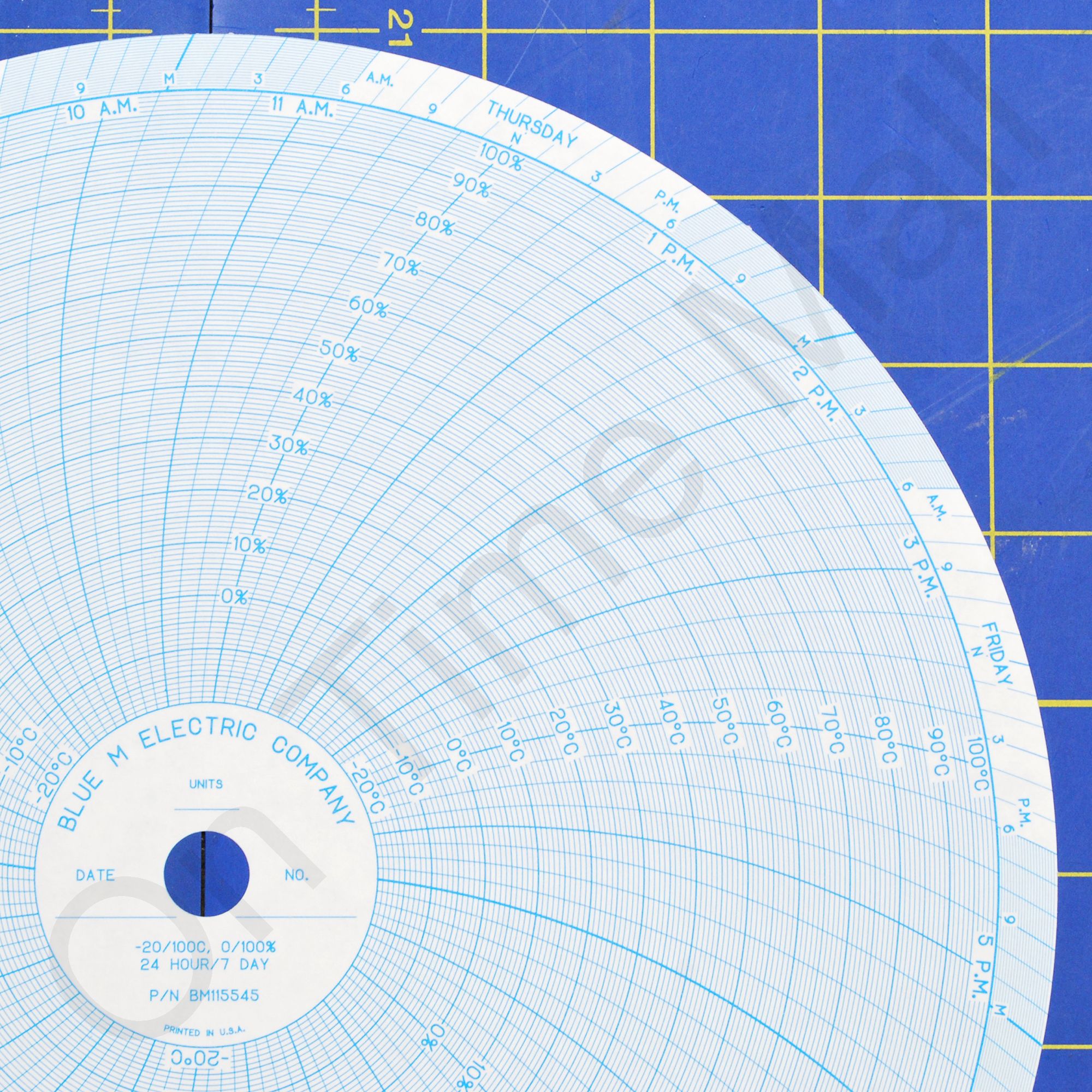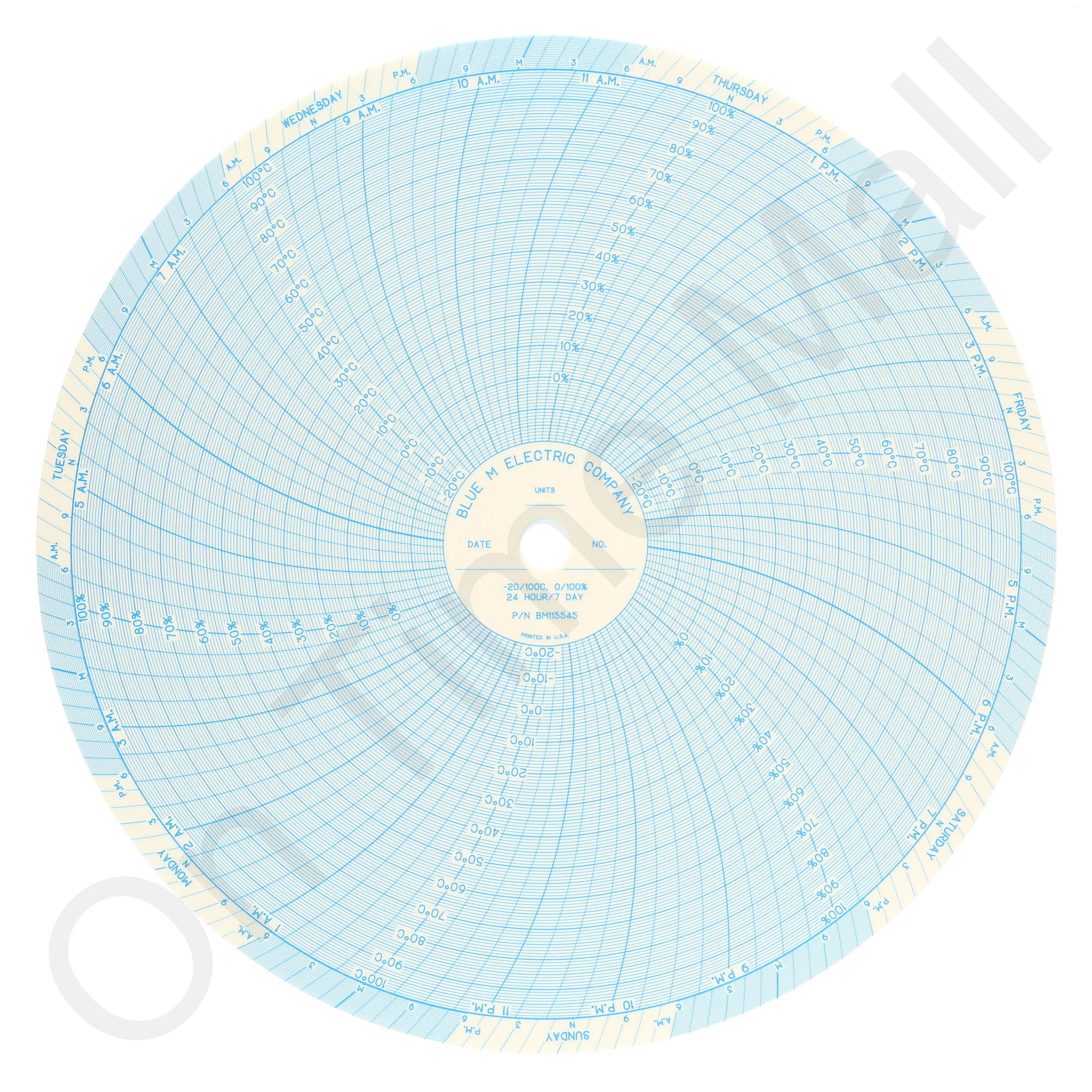 Blue M BM115545 Circular Charts. Replacement circular charts for Blue M industrial chart recorder. Package contains 100 circular charts. Chart Size: 09.938 Inch Time Rotation: 24 Hour / 7 Day Number of Ranges: 2 Ranges: (-20) - (100), Per Table, -20°C TO 0°C TO 100°C BY 10°C (-20) - (100), Per Table, 0% TO 100% BY 10% Note: This paper has a 5 box minimum and 3-4 week production lead time.