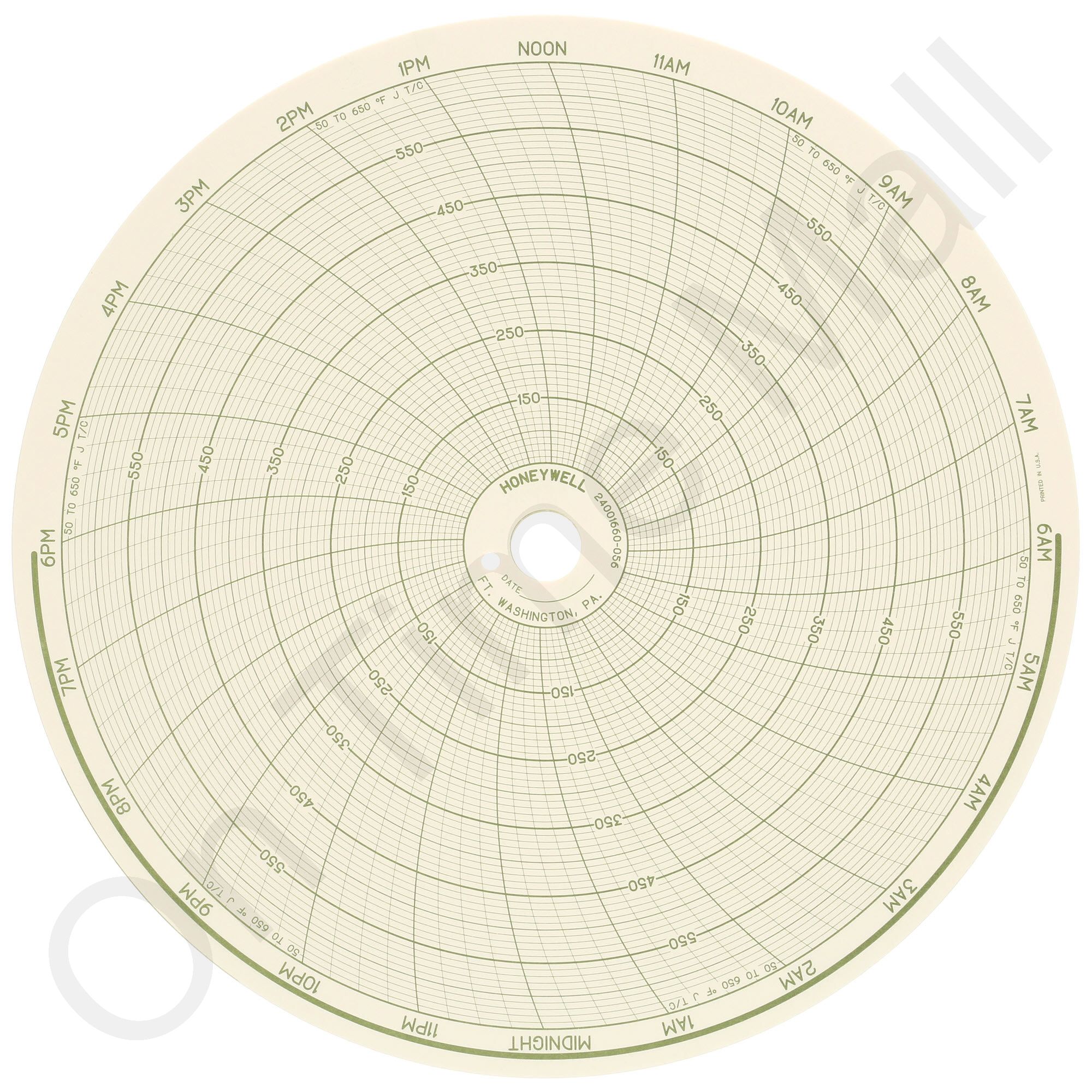 Replacement circular charts for Honeywell industrial chart recorder. Package contains 100 circular charts. 50 - 650, 24H, 10 inch.