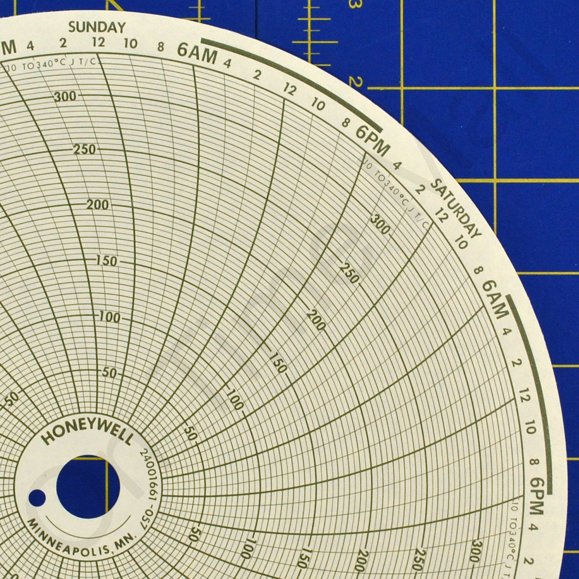 Replacement 10 round circular charts for Honeywell industrial chart recorder. Package contains 100 circular charts. Range is 10 - 340 centigrade on a 7 day chart.