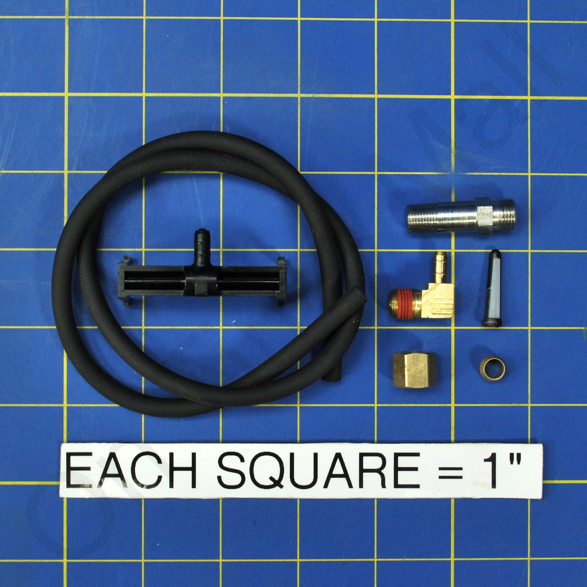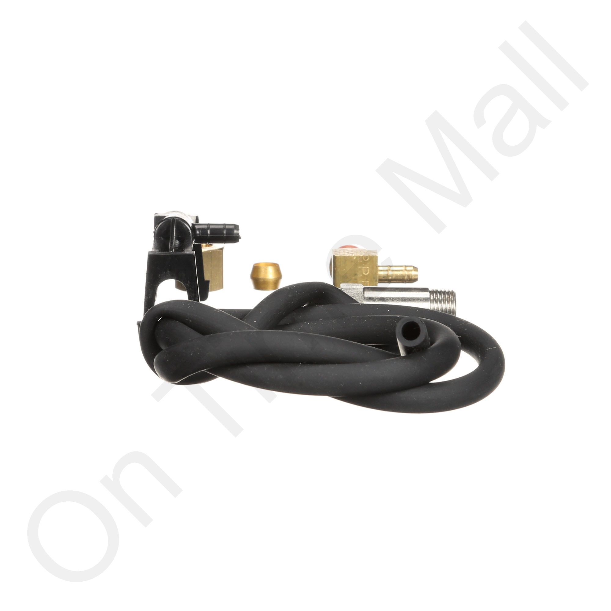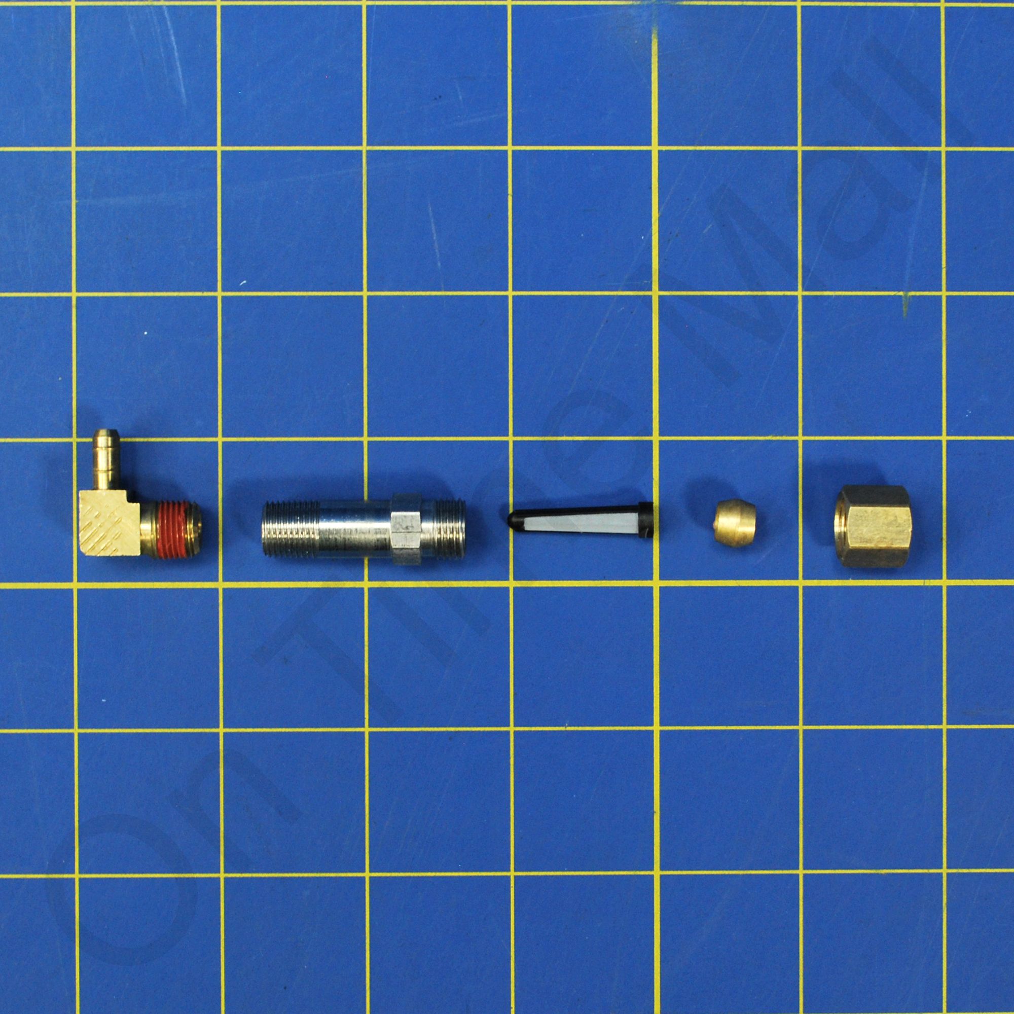 Honeywell 32001752-001 Hardware Kit For Solenoid Assembly. Includes 22.5" long x 5/32" ID feed hose, orifice, water distribution nozzle, strainer screen, brass compression nut, ferrule and brass outlet 90 degree fitting.