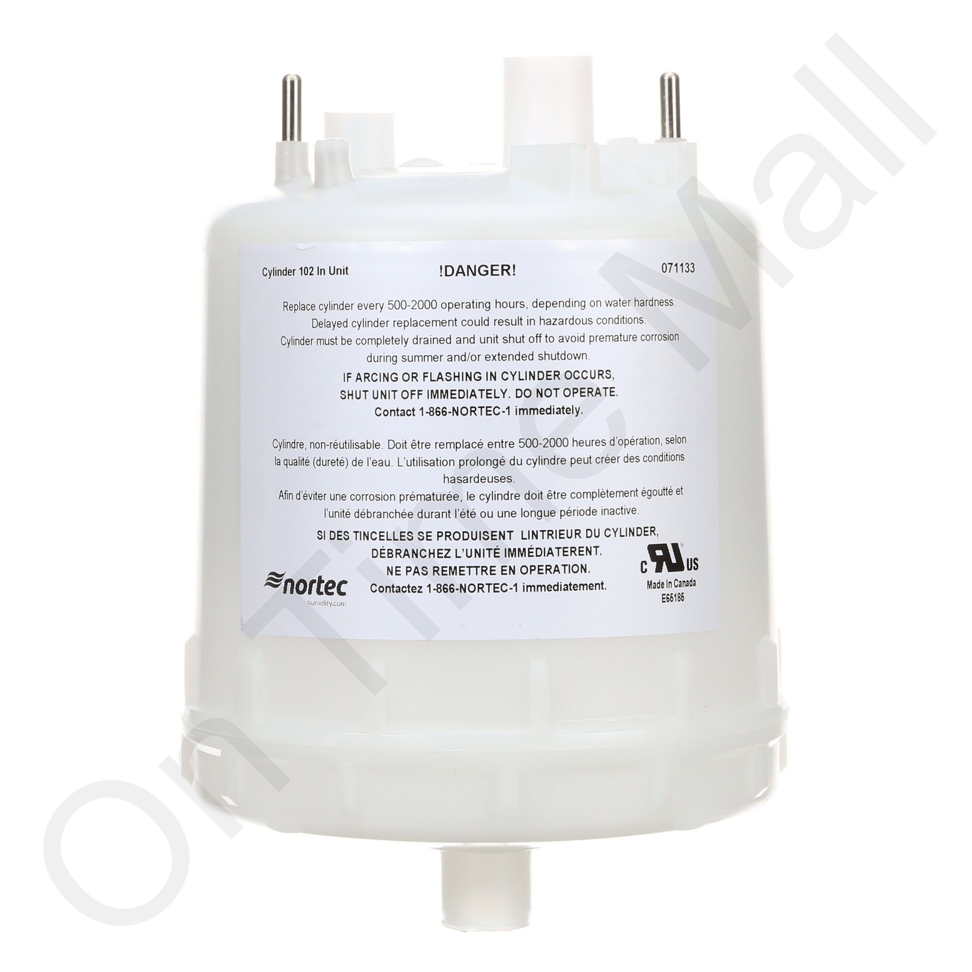 Nortec 102 Steam Cylinder. Replacement 102 steam tank for Nortec steam style humidifier. Designed for 208 volt to 277 volt single phase operation. Made for models rated at up to 5 pounds of steam per hour. This item is also known as Canatal part 1519702-102.