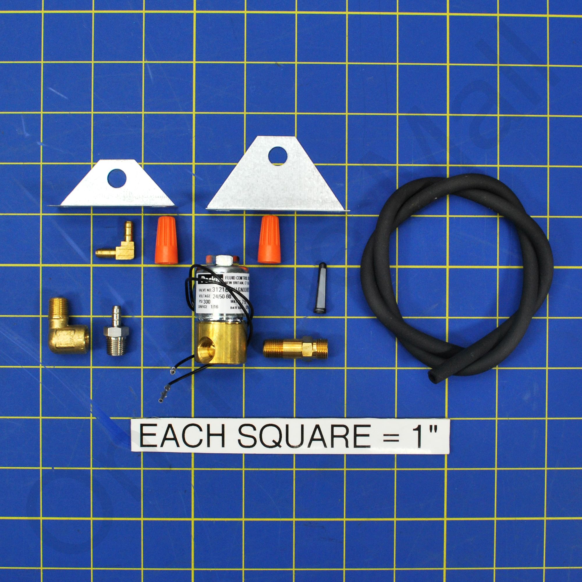Skuttle Solenoid Valve Assembly A01-0814-148. Replacement solenoid valve kit replaces 24 volt Skuttle whole house humidifier solenoid valves. Includes brass fittings, hose, strainer screen, electric solenoid valve, orifice and 2 mounting plates. On some of the newer versions of this kit the valve body is stamped 1 for OUTLET and 2 for INLET.